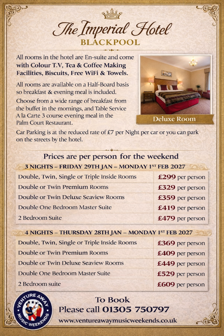 Thursday 28th or Friday 29th January - Monday 1st February 2027 at The Imperial Hotel - Blackpool